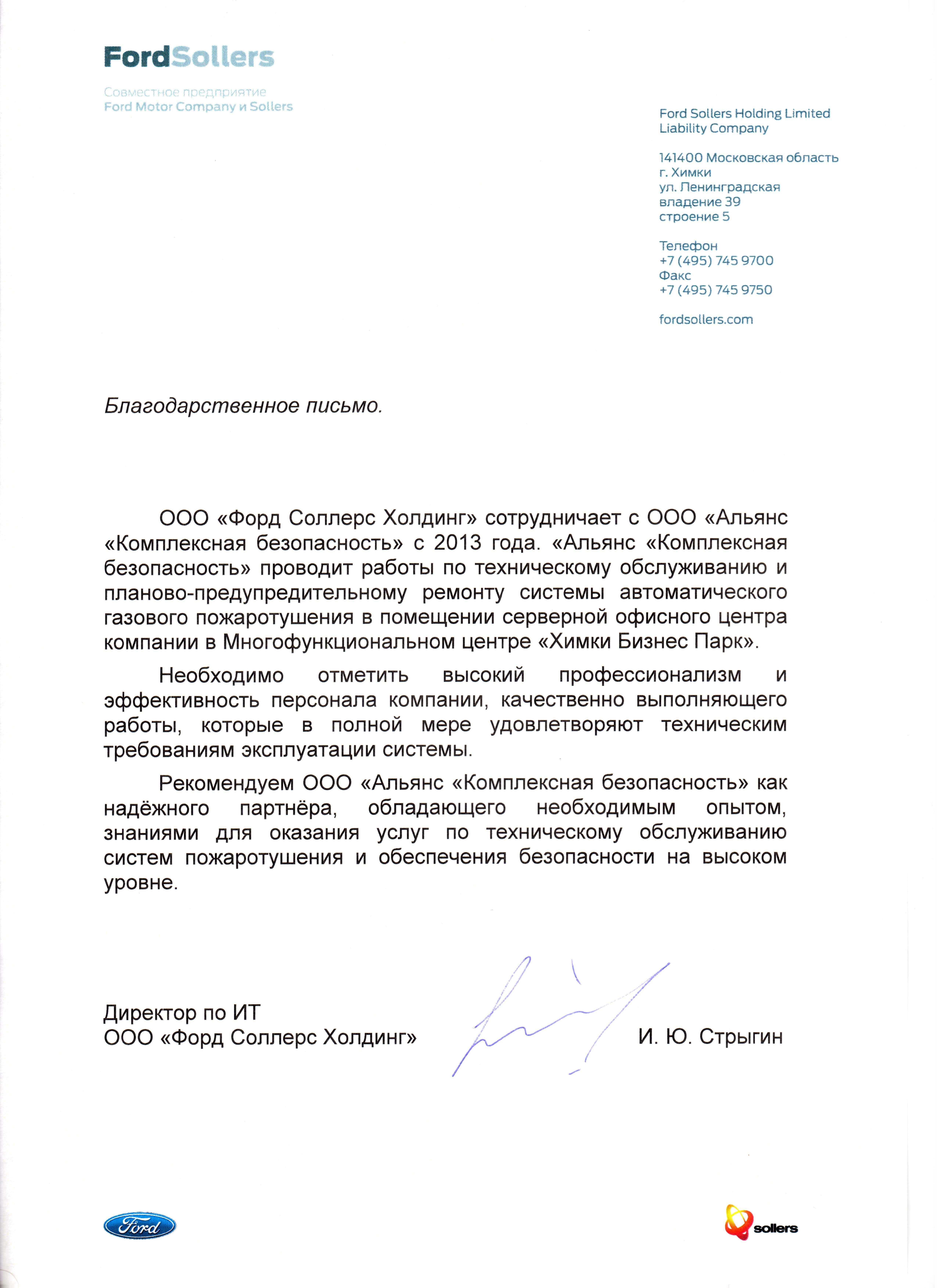 ООО "Форд Соллерс Холдинг" сотрудничает с ООО "Альянс "Комплексная безопасность" с 2013 года. "Альянс "Комплексная безопасность" проводит работы по техническому обслуживанию и планово-предупредительному ремонту системы автоматического газового пожаротушения в помещении серверной офисного центра компании в Многофункциональном центре "Химки Бизнес Парк".